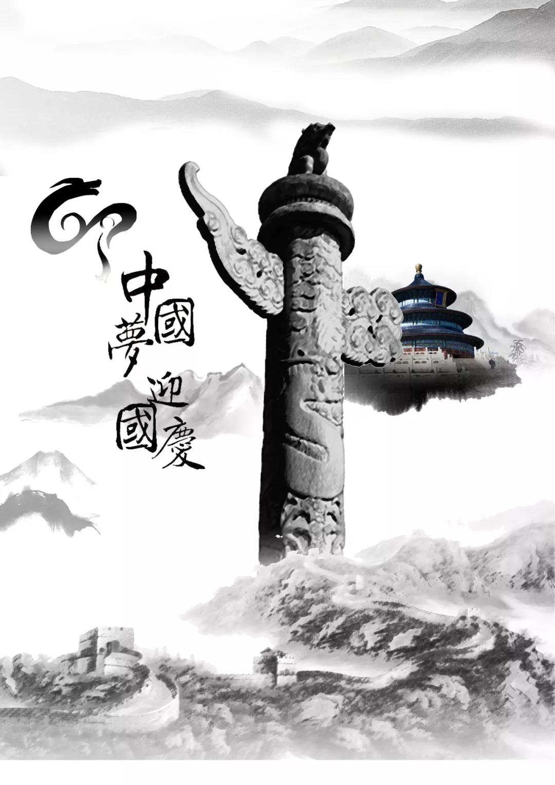 中华泱泱大国有上下五千年的历史,作为文明古国的我们,有自己的文化,自己的风格。所以我想以中国传统水墨作为这次国庆海报的主基调,即彰显传统风格,又与传统的红色海报区分开来。海报的主体是水墨的华表柱,华表是耸立在天安门前高大汉白玉柱,是一种汉族传统建筑,是一种图腾标志,是中华民族的信仰。华表底部盘旋这长城,长城是抵御外敌的城墙,是中国历史的见证。而华表的右边是北京传统建筑天坛,天坛是古代祭祀场所象征中国传统的礼教,中华文化。左边是以龙的形象盘踞的69象征着建国69周年,龙下的是毛笔字中国梦迎国庆,“绿水青山就是金山银山”是中国梦所以用了很多水墨山水作为这张海报的点缀。以山水之情展现中国文化。喜迎国庆。