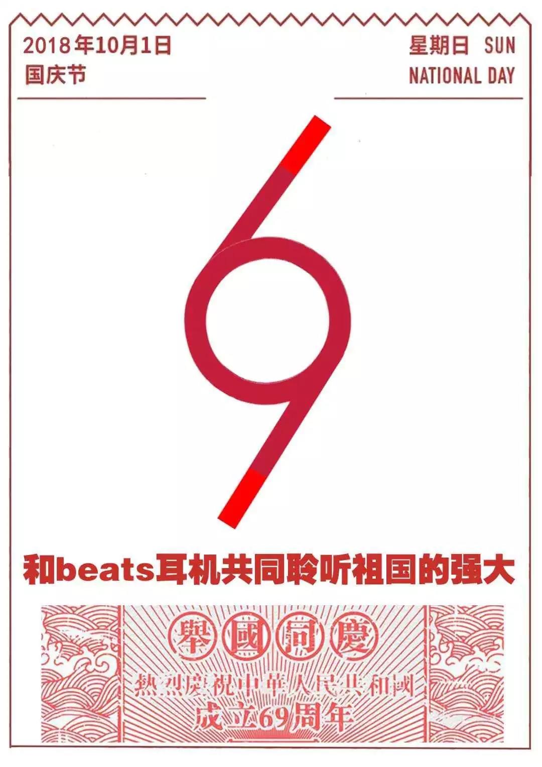 此作品采用了日历的版式设计,强调了日期,更突出了国庆这一主题,69周年与beats品牌的结合标新立异,位于平面的中央也突出了祖国的地69周年,69周年与文案采用朱红色寓意祖国的红红火火,也突出了品牌,与旁边地淡红色形成了对比。