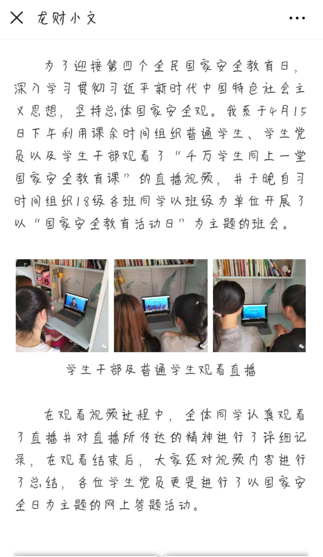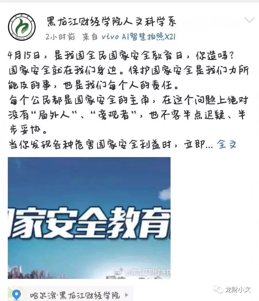 我系高度重视本次国家安全教育日学习活动,除组织学生观看直播视频、开展班会活动外,还利用我系微信公众号龙财小文、人文科学系官方微博以及我系中厅电子屏对本次学习进行了报道与宣传。