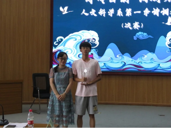 人文科学系汉语言文学专业“诗传古韵,词润芳华”第一届诗词大会在汉语言文学专业教研室主任李影辉老师的致辞中顺利结束,随后小辉老师为冠军颁发属于他的荣誉--冠军奖杯。沉甸甸的一座奖杯,代表的不仅仅是本次诗词大会所获得的成就,中华诗词源远流长,传统文化历久弥新。我辈学子前行于文化发展的浪潮中,一字一句,一笔一划,所吟诵的,所书写的,皆是身为中华儿女的自豪。
