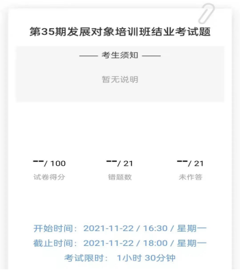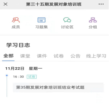 为贯彻落实新时代党的建设总要求,确保党员发展质量,近日开展了第三十五期发展对象培训班,11月22日16:30—18:00,人文学院党总支组织学员参加结业考试,按照疫情防控要求,此次采取线上考试的形式,考试成绩合格者颁发结业证书。