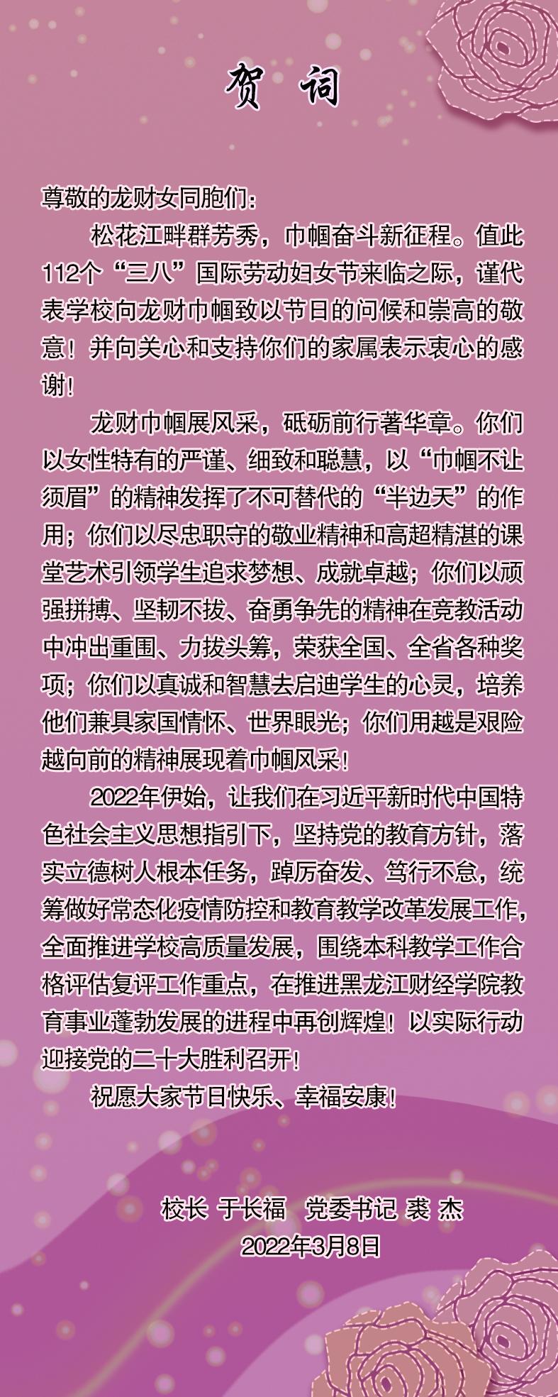 黑龙江财经学院“三八”国际劳动妇女节贺词