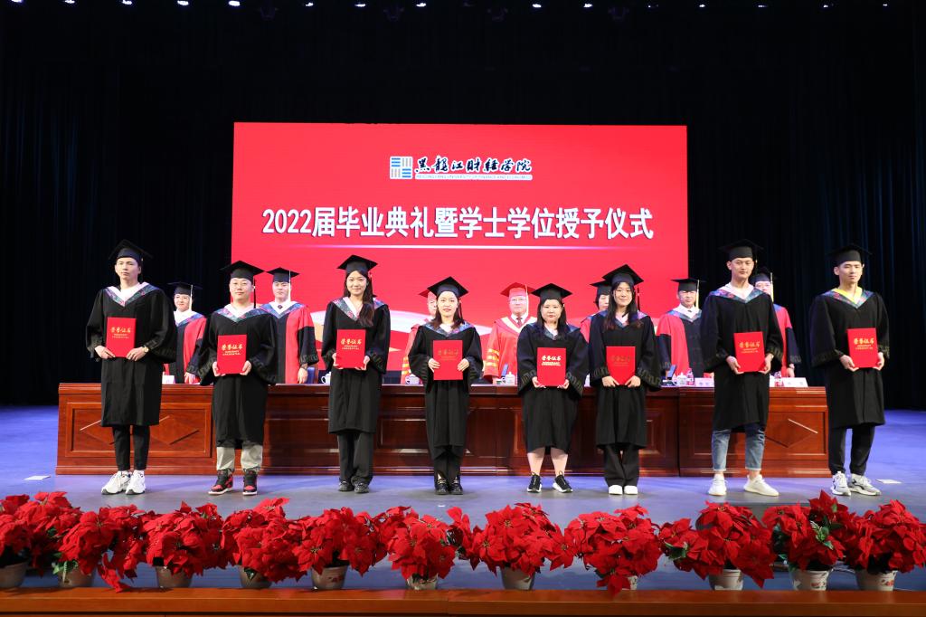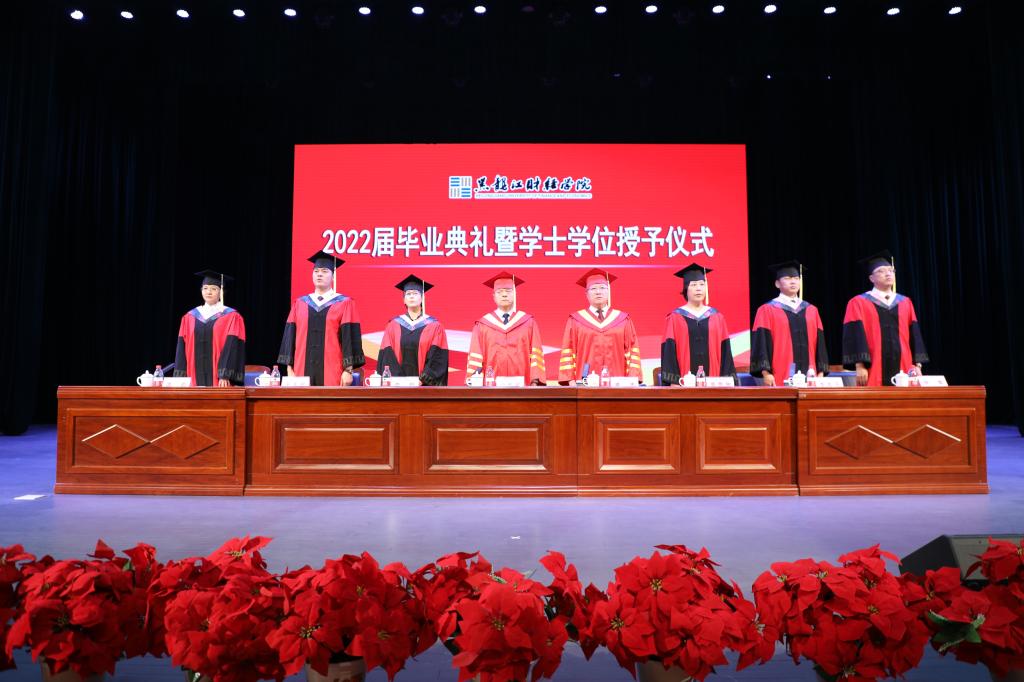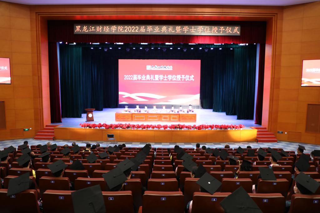 在花开似锦的六月里,黑龙江财经学院2022届毕业生们,带着追梦圆梦的憧憬和希望,满怀喜悦和不舍,迎来了他们大学四年最为神圣而光荣的时刻。6月17日,2022届毕业典礼暨学士学位授予仪式在音乐厅隆重举行,典礼采用“现场+直播”的方式同步进行。校长于长福等校领导在主席台就坐。毕业典礼由党委书记裘杰主持。