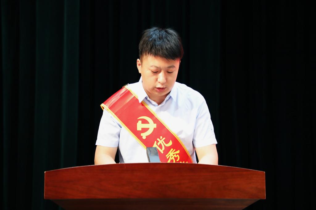 马克思主义学院朱力超代表受表彰的集体和个人发言,表示要发挥党员的先锋模范作用,敢于担当,敢于负责,以饱满的精神状态,务实的工作作风,突出的工作业绩,全力以赴打好教学合格评估攻坚战,为党的二十大胜利召开献礼。