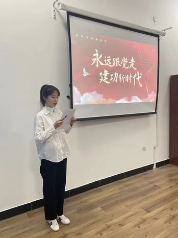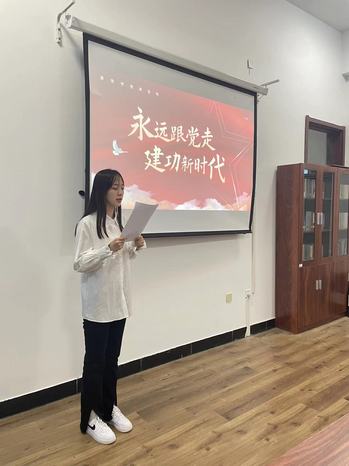 学生党员康佳发表党史演讲《永远跟党走,建功新时代》。新时代的建设尚未完成,每一位共产党员都应该跟随党的脚步,适应党的发展,以党史作为参考,不断完善,为建设更好的时代努力。我们要明确自己身上的责任,随时准备为国家建设贡献出自己的一份力量。我们要铭记党史,传承党的精神,发扬艰苦奋斗作风,为人民服务。在党史的学习中,我们面对现实情况,从中总结吸取经验,提高工作效率,促进未来建设。