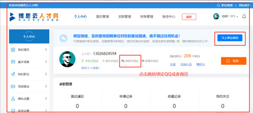 5、注册完成后进入“个人中心”,之后可绑定微信或者QQ登录,返回首页可查看企业和招聘岗位。