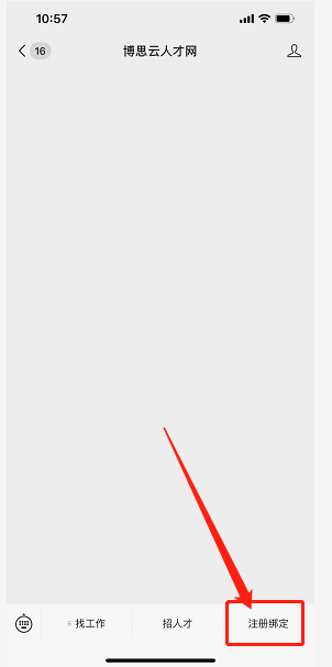 1、关注微信公众号“博思云人才网”或扫码关注,点击底部菜单栏最右边“注册与绑定”。