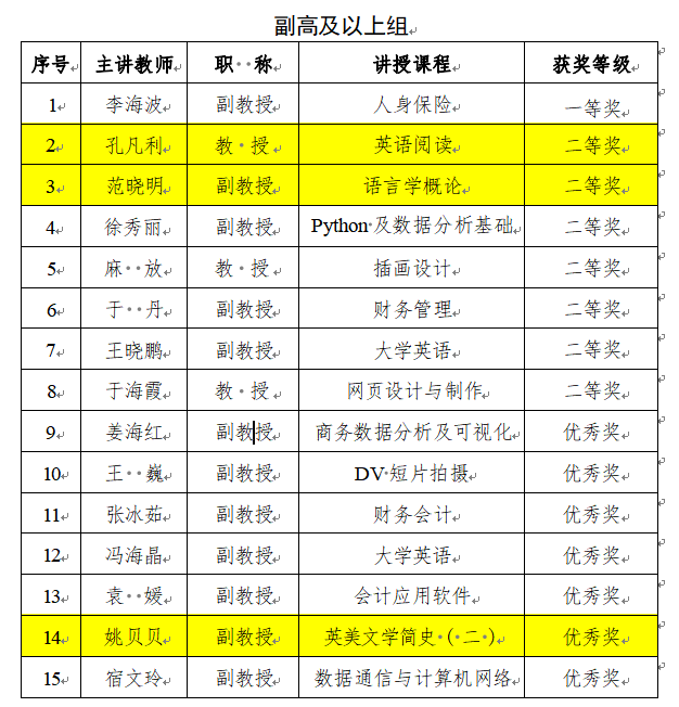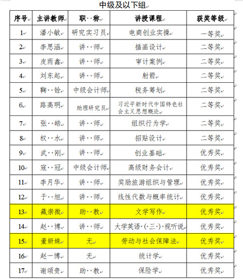 黑龙江财经学院第三届教师教学创新大赛于2023 年2 月7 日圆满结束,经各教学单位选拔推荐,共 32 名教师参加决赛。决赛采用线上评审的方式,我院教师共获副高及以上组二等奖2项、优秀奖1项,中级及以下组优秀奖2项,获奖名单公布如下。