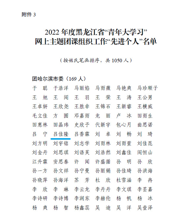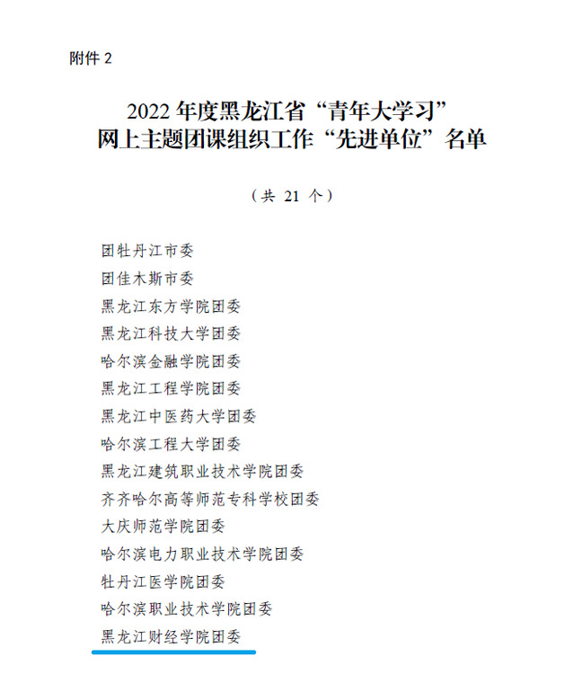 近日,由共青团黑龙江省委员会组织开展的2022年度黑龙江省“青年大学习”网上主题团课组织工作评选结果已公布,我院取得优异的成绩。人文学院团总支荣获2022年度黑龙江省“青年大学习”网上主题团课组织工作“先进集体”称号。曹英军荣获2022年度黑龙江省“青年大学习”网上主题团课组织工作“先进个人”称号。