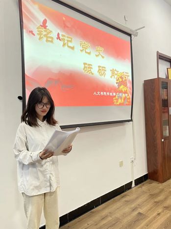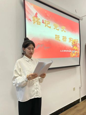 学生党员张鑫媛发表有关党史演讲《铭记党史,砥砺前行》。学好党的历史,才能把握今日,把握今日才能创建明天,从革命前辈的手里接过历史的接力棒,我们这代人要做好承上启下的历史任务,不断保持和发扬党的成功经验。党的历史像一条河,曲折但是坚决地向着一个方向流淌,点点滴滴都闪耀着光辉。我们要做这长河中的一滴水,任他洪水猛兽还是壁立千仞都无所畏惧,坚决不移的跟党走。