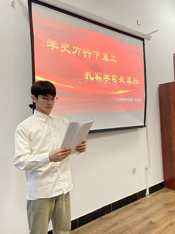学生张凯发表以《坚忍不拔,自强不息》为题的党史演讲,他提到“历史充分证明了我国的道路优势、理论优势、制度优势和文化优势,在当今两个大局交织、两个百年交汇的历史节点,我们要增强历史自觉,扛起使命担当,在风险挑战面前迎难而上,不断激发为实现中华民族伟大复兴而奋斗的信心和决心。”