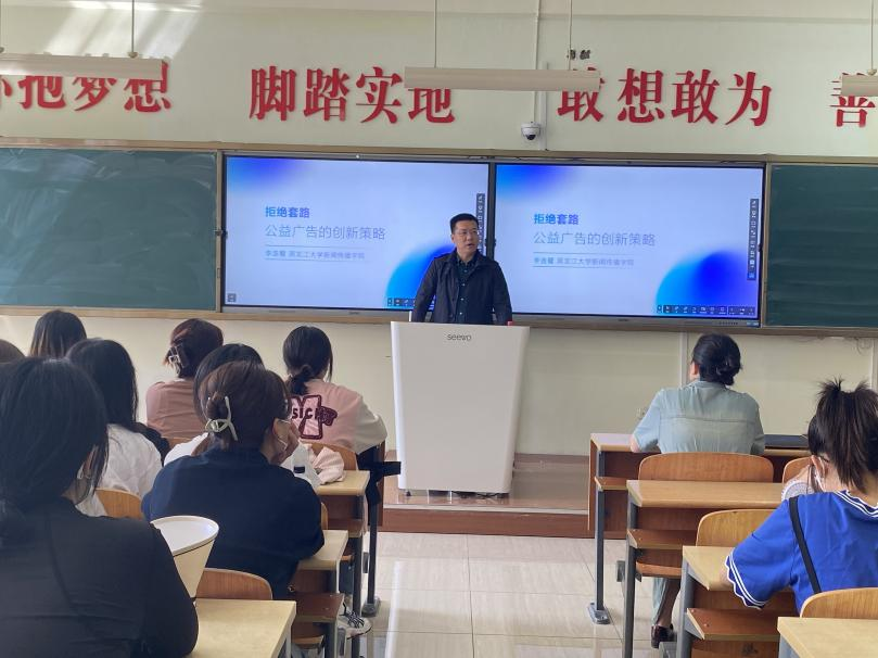 李连璧老师先由一段视频引入主题,向现场同学提出“公益广告的创新策略”的问题,也激发了广大学生的热情,他们与老师积极互动,老师就很多常见的公益广告面临的创意困境问题展开了详细热烈的讨论,并谈了公益广告的创新思路方向,并就实际案例向同学们剖析了观念革新的创意广告策略特征,向同学们说明了几点特征变化,举例说明当前针对中国公益广告面临的创意困境的破局方法以及公益广告创新策略。