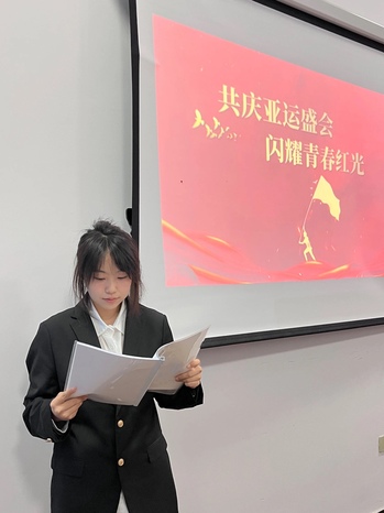 本次活动由2021级汉语言文学专业3班申小雨主持,该生表示:“作为新时代的青年,应大力弘扬体育精神,以“使命在肩、奋斗有我”的责任担当,勇于奋斗、超越自我。要从自身做起,用青春的语言传递体育热情,用积极的心态展现体育风采,展示新时代青年的激情和风采。”
