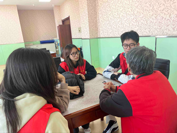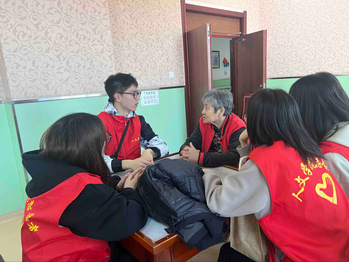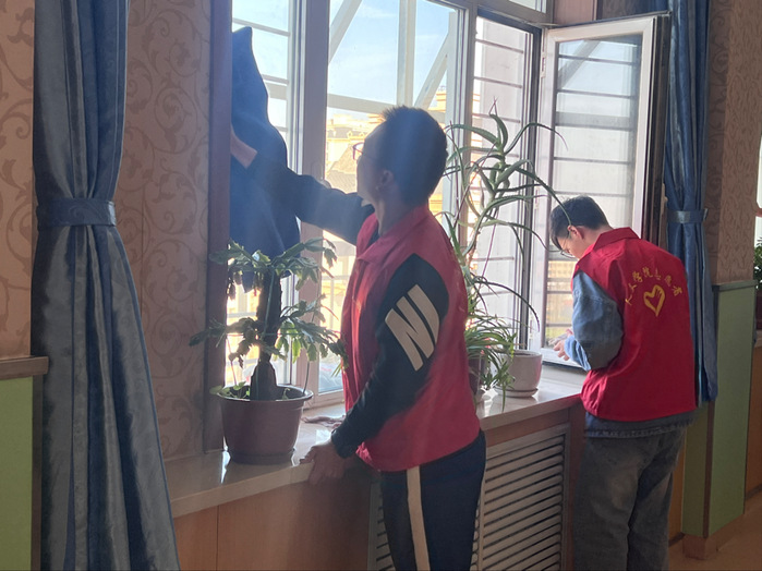 活动中,陈奶奶与学生们亲切交谈,期间陈奶奶讲述自己年轻时任课教师的经历,其独特的教育理念受到成员的一致好评。此外,陈奶奶还询问了在场同学们所学专业的授课内容和未来规划,同时传授分享了一些有效的学习经验。一番交谈后,同学们耐心地帮助护工阿姨擦拭门窗,教老人使用智能手机,表演才艺等,本次志愿服务活动将团队协作、和谐友爱的氛围渲染到了高潮。