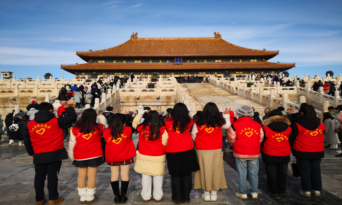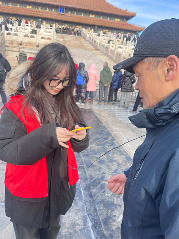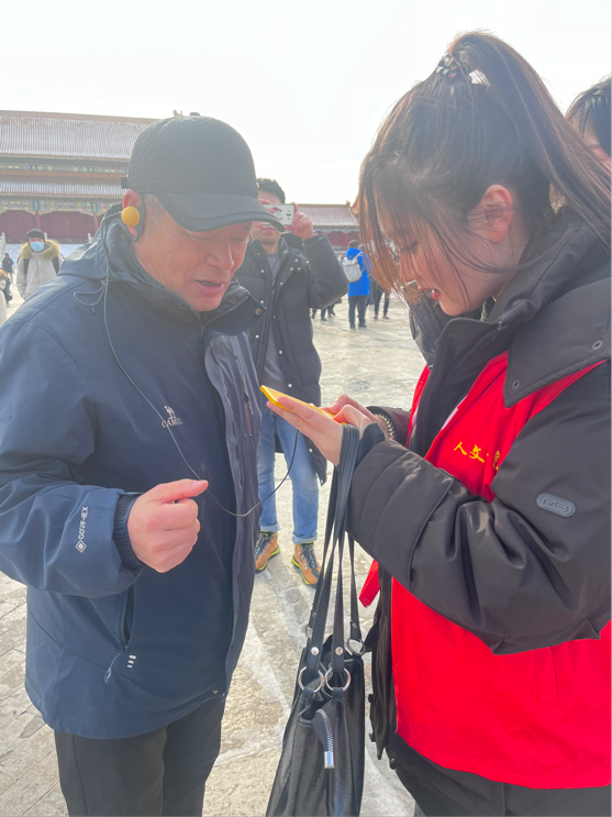 2023年12月22日,学生第一党支部书记周静、人文学院教师张成伟带领支部10名学生走进北京故宫博物馆开展以“用语言温暖人心”为主题的志愿服务活动,用文字和故事向游客传递温暖与力量。