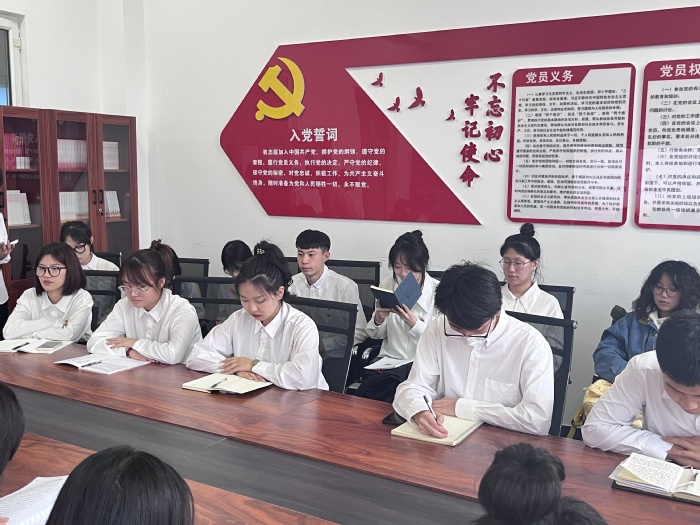 第三党支部学生代表尹纹博发言:两会精神是指中国全国人民代表大会和中国人民政治协商会议。对于我们学生群体而言,可以从以下几个方面来解读与落实:首先是爱国主义教育:我们应当学习两会中体现的国家发展战略和民族复兴大业,培养强烈的爱国情怀和社会责任感。其次是教育公平与发展:两会常强调推进教育公平,如优质教育资源均衡分配、特殊教育支持等,我们应该关注并参与校园公益活动,促进同伴间的互助互学。最后是个人成长与社会服务:我们结合两会关于人才培养、青年成长的话题,明确自身学业规划和发展目标,锤炼能力,为将来更好地服务社会、投身国家建设做好准备。
