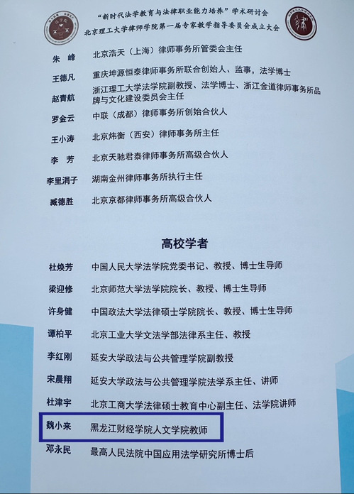 3月30日,由北京理工大学法学院、北京理工大学律师学院主办的“新时代法学教育与法律职业能力培养学术研讨会暨北京理工大学律师学院第一届专家教学指导委员会成立大会”顺利召开,人文学院教师魏小来以高校学者身份受邀参会并作专题报告。