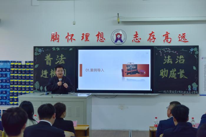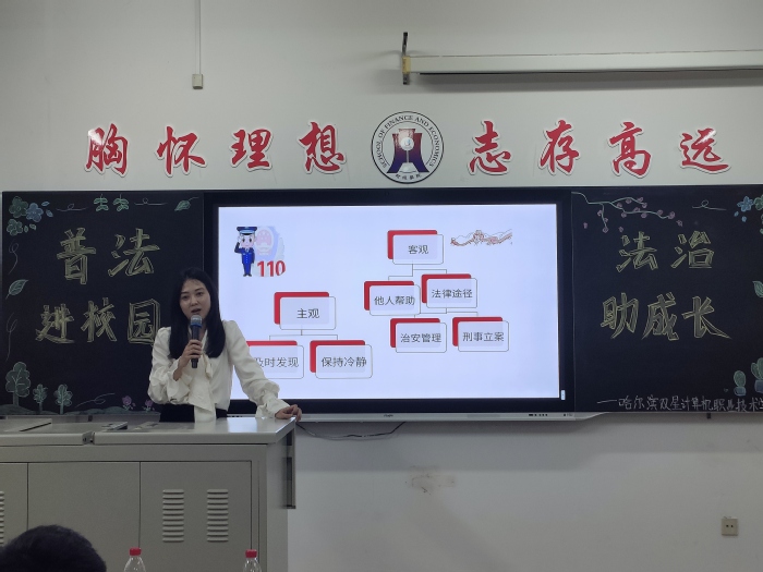 为切实提升我院学生专业素养和社会实践能力,在社会课堂中受教育、长才干、作贡献,利用专业知识引导广大社会群体接受法治教育、提升知法懂法水平,达到双向赋能的普法宣传目的。我院特组织带队教师、优秀党员、积极分子代表成立普法宣讲团,由党总支书记孙铭壮、院长张雅秋、团总支书记曹英军及各党支部书记带队,一行16人于4月17日赴哈尔滨双星计算机职业技术学校开展活动。