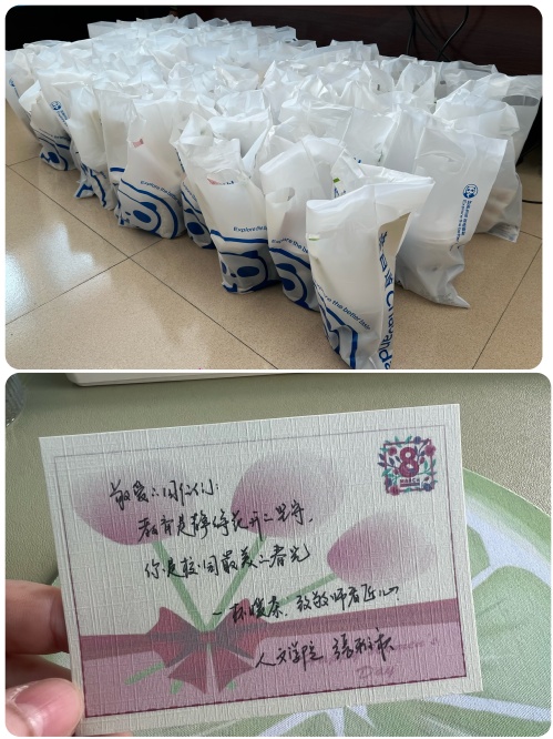 张雅秋代表学院领导班子向全院女教师致以节日的问候,并向全体教师表达了诚挚的感谢。她表示,教师是学院发展的中坚力量,每一位教师都为学院的建设和发展付出了辛勤的努力。在这个特别的日子里,希望通过一杯奶茶,传递学院对大家的关怀与温暖。同时,张雅秋还为全体教师写下寄语卡片。